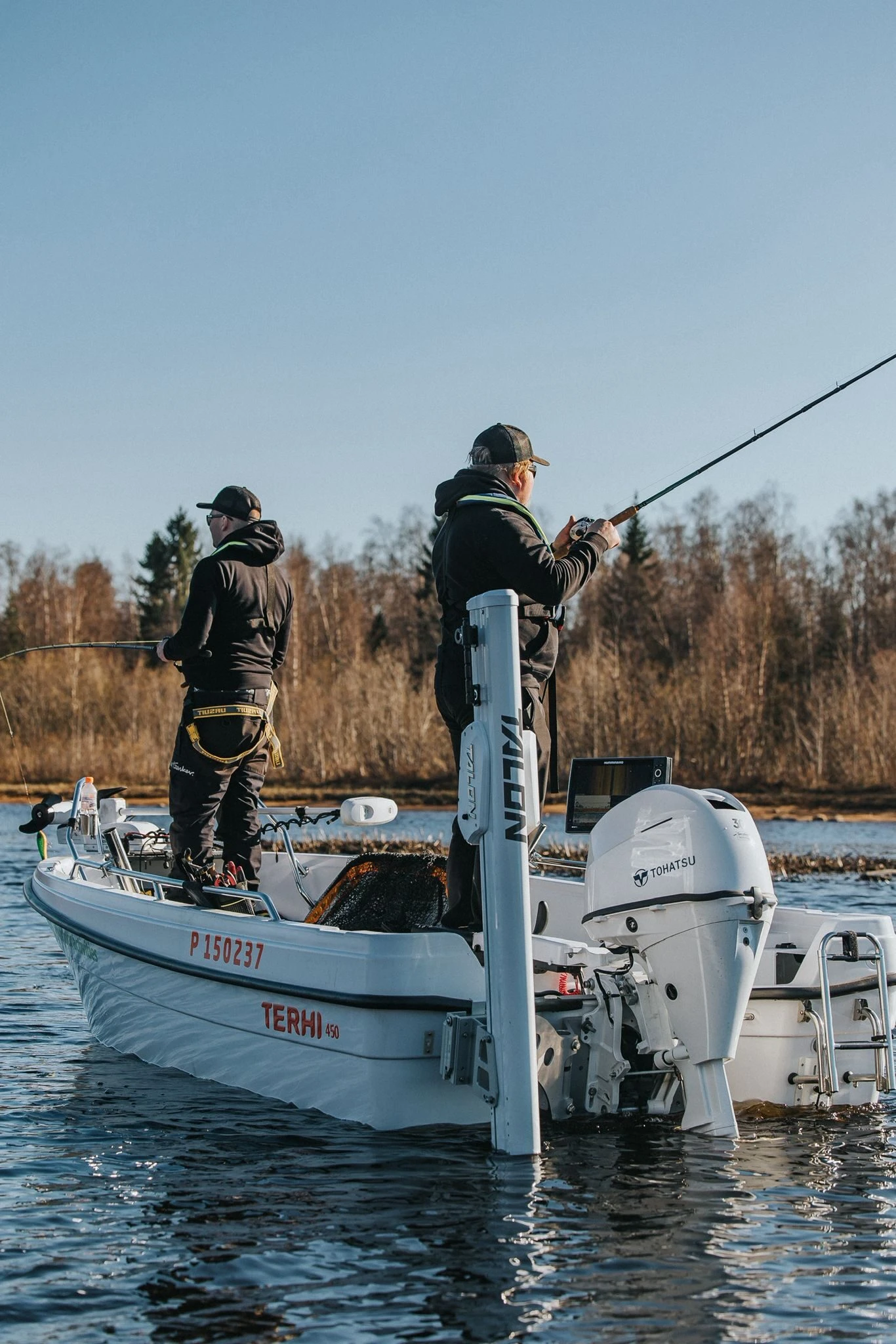 Terhi 450 vene on rekisteröity viidelle (C5) hengelle ja veneessä on vuokraveneen mukainen katsastusvarustus. Moottorina venettä liikuttaa luotettava Tohatsu 30hv PowerTiller ohjauksella. Veneessä on Humminbird 15" viistokaikuluotain sekä Minn Kota Riptide keulasähkömoottori. Veneeseen mahtuu oppaan lisäksi kalastamaan mukavasti kaksi henkilöä. Täysvarusteltu heittokalastusvene on rekisteröity viidelle hengelle ja veneessä on vuokraveneen mukainen katsastusvarustus. Vene on lähtövalmiina jarruttomalla trailerilla. Vuokraamme tarvittaessa myös laadukkaita heittokalastusvälineitä, kysy tästä lisää.